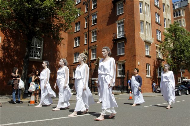 Le jour de la Pentecôte, toujours à Londres, à l'extérieur de l'Eglise Ste Sophie, la délégation a présenté un petit - petit en durée mais symboliquement puissant- spectacle musico-théâtral qui prenait appui sur des mélodies composées par Pandelis Pavlidis et des textes d'Alcée et de Sapphô. L'Hymne orphique à Apollon a été spécialement dédié à l'Absente.